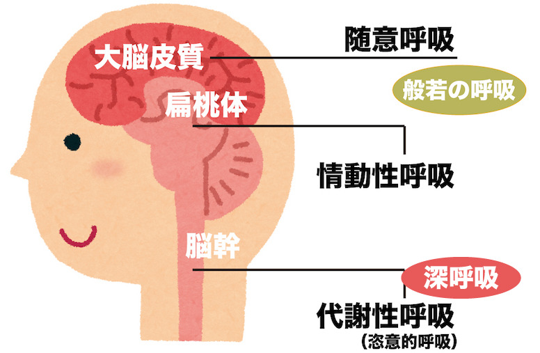 大脳皮質で行う<般若の呼吸/随意呼吸>だと、空気が抜けたように、力が抜けて頭がクラクラしますが、すぐに頭がすっきりしてきます。脳と呼吸は、切っても切れない関係にあります。